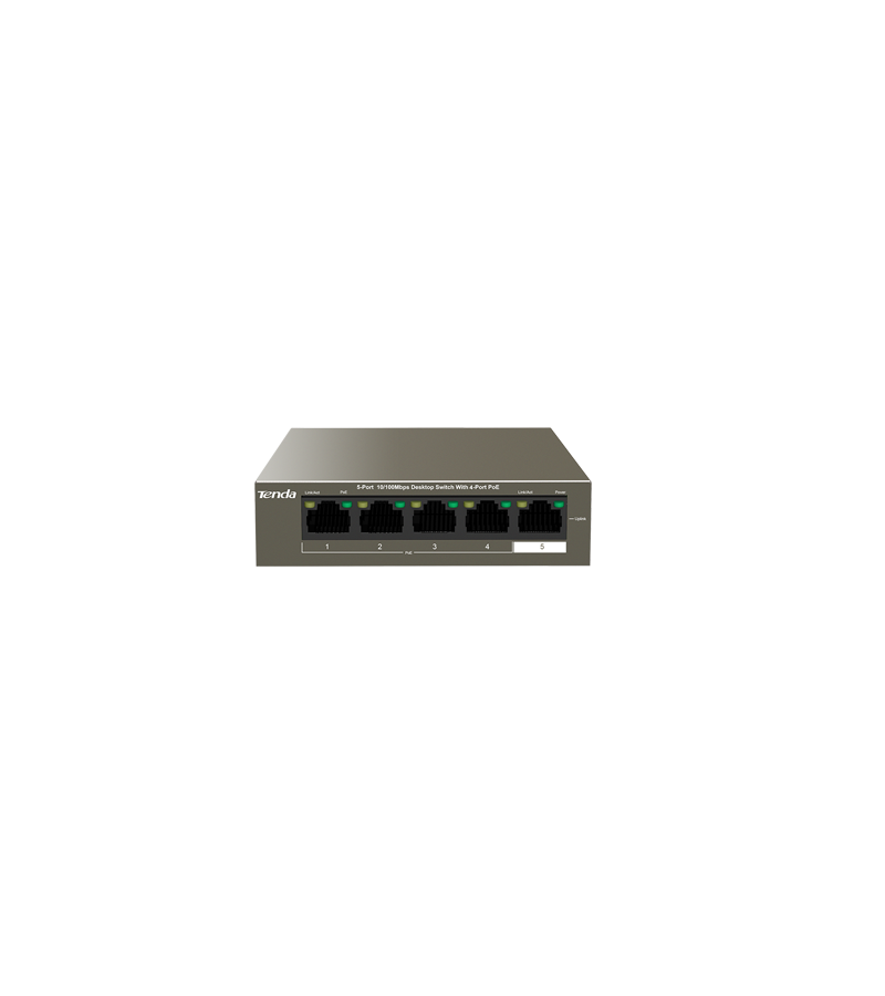 TEF1105P-4-63W is a Tenda PoE switch that offers 5 10/100 Mbps Base-TX RJ45 ports. Up to 250 meters long distance transmission, beyond hundred meters transfer limit. 6KV lightning protection PoE switch is the real monitoring private switch. Ports 1-4 support IEEE 802.3at and IEEE 802.3af PoE standard. It provides 30W maximum PoE output a single port and 58W the whole device.